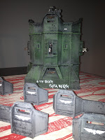 Aquí podemos ver un detalle de la pintada que le he hecho al bastión en un lateral, "Si vis pacem, para bellum". En la foto no se aprecia demasiado, pero el bastión me ha quedado en unos tonos verdosos a los que ya me he acostumbrado, pero que no era lo que pretendía cuando empecé a pintarlo.Para pintarlo simplemente lo imprimé en negro y apliqué capa tras capa de pincel seco, empezando con un gris oscuro de la marca Titan y seguidamente diferentes tonos de verde, desde verde ángeles oscuros a verde gretchin.